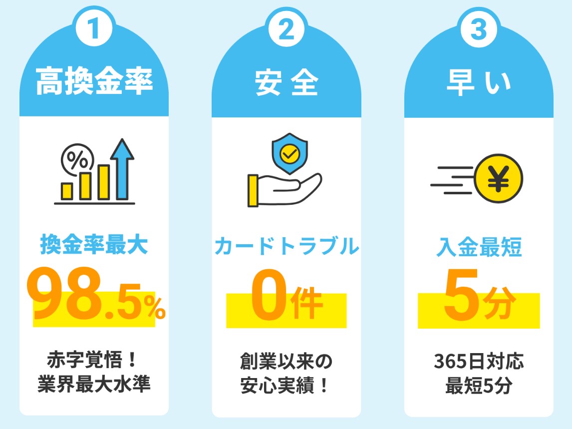 現金化本舗は『高換金率とスピーディーな振込体制、安全面が確立している』サービスとします。