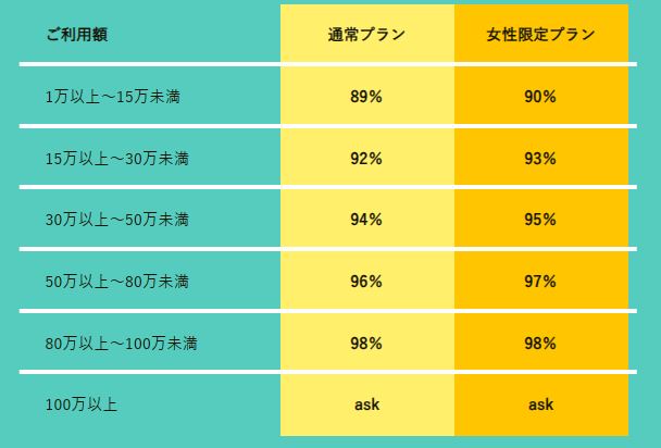 最高換金率は変わりませんが、少額の利用時には1%アップするのでオトクに現金化ができます。