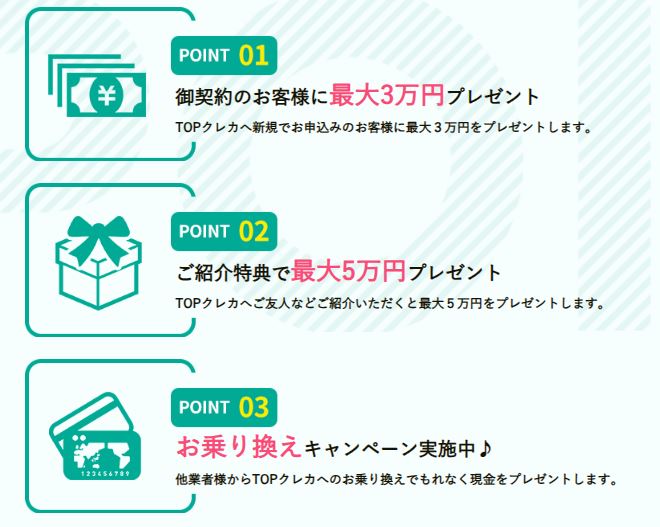 特に初回利用時の現金プレゼントは誰でも利用できるため、TOPクレカを利用したことがない人には大きなメリットと言えるでしょう。
